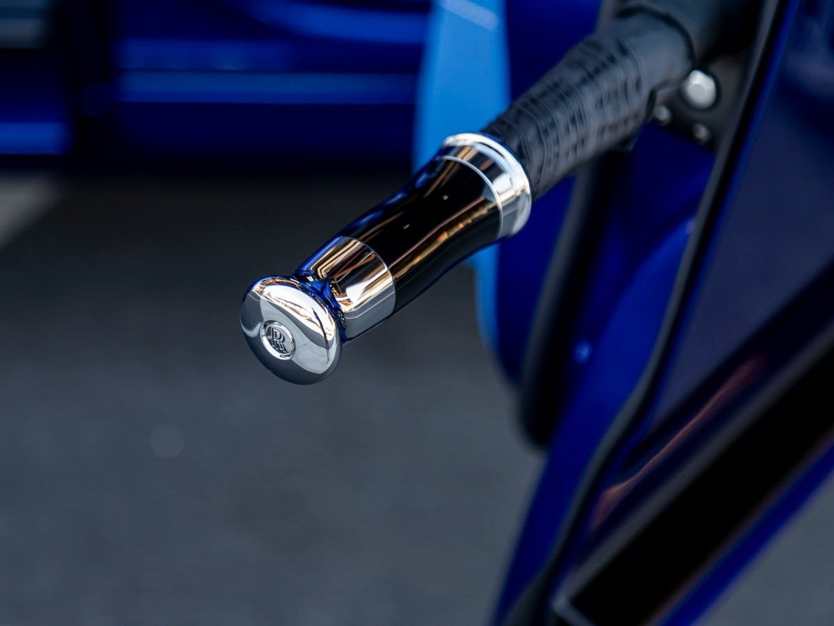 Inside, the cabin is a vision of tailored elegance with a Radiant Blue primary interior, Black secondary color, and Grace White tertiary accents, brought to life through Bespoke Interior Module Editing. An Extended Leather Headliner and the awe-inspiring Shooting Star Headliner evoke a celestial ambiance, perfectly complemented by the Instrument Panel with Top Stitch and Grace White Coloured Seat Piping. The Lounge Seats with Headrest Cushions elevate comfort, while the Illuminated Black Badge Treadplates and Black Badge Technical Carbon Extended Veneer in High Gloss remind you of the bespoke craftsmanship at every touch.