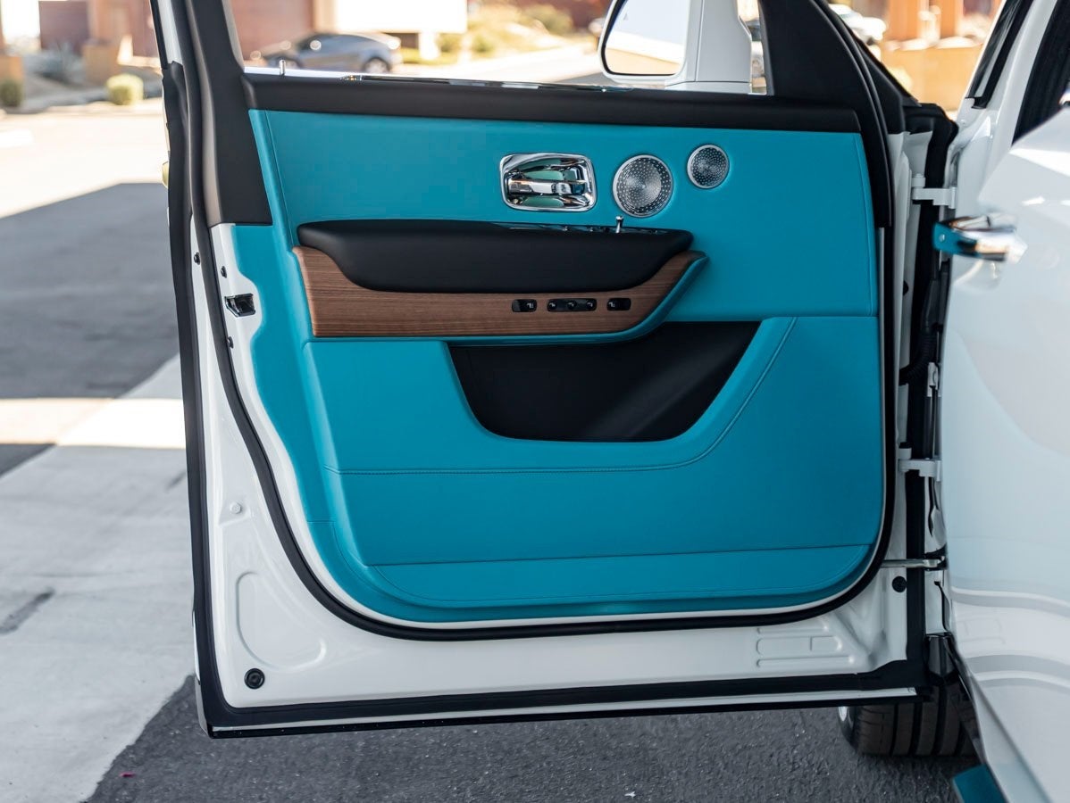 Step inside to discover a bespoke sanctuary finished in Turchese with Black accents. Appointed with Coloured Seat Piping in Grace White, Coloured Stitching in Black, and a Leather Extended Headliner, every inch is tailored to perfection. The cabin is enriched by Open Pore Royal Walnut Veneer, a Shooting Star Headliner, and the exclusive Illuminated Treadplate Cullinan. Rear passengers enjoy the ultimate indulgence with the Rear Theatre Configuration, Picnic Tables, and plush Lambswool Footmats, while the Rolls-Royce Bespoke Audio offers an immersive listening experience.