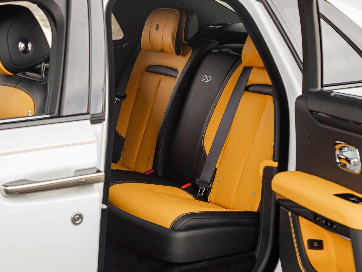 The Black Badge Ghost commands presence with its clean, monolithic design and unmistakable Rolls-Royce silhouette. The Arctic White finish provides a stunning contrast to its darker, more assertive Black Badge elements, creating a visual statement that is both modern and timeless. Bespoke details such as the Single Coachline and Body Colored Wheel Centers enhance its tailored aesthetic, while the Pinstripe Applied to Wheel Centers in Forge Yellow and Painted Brake Calipers in Forge Yellow introduce a bold, performance-inspired accent.