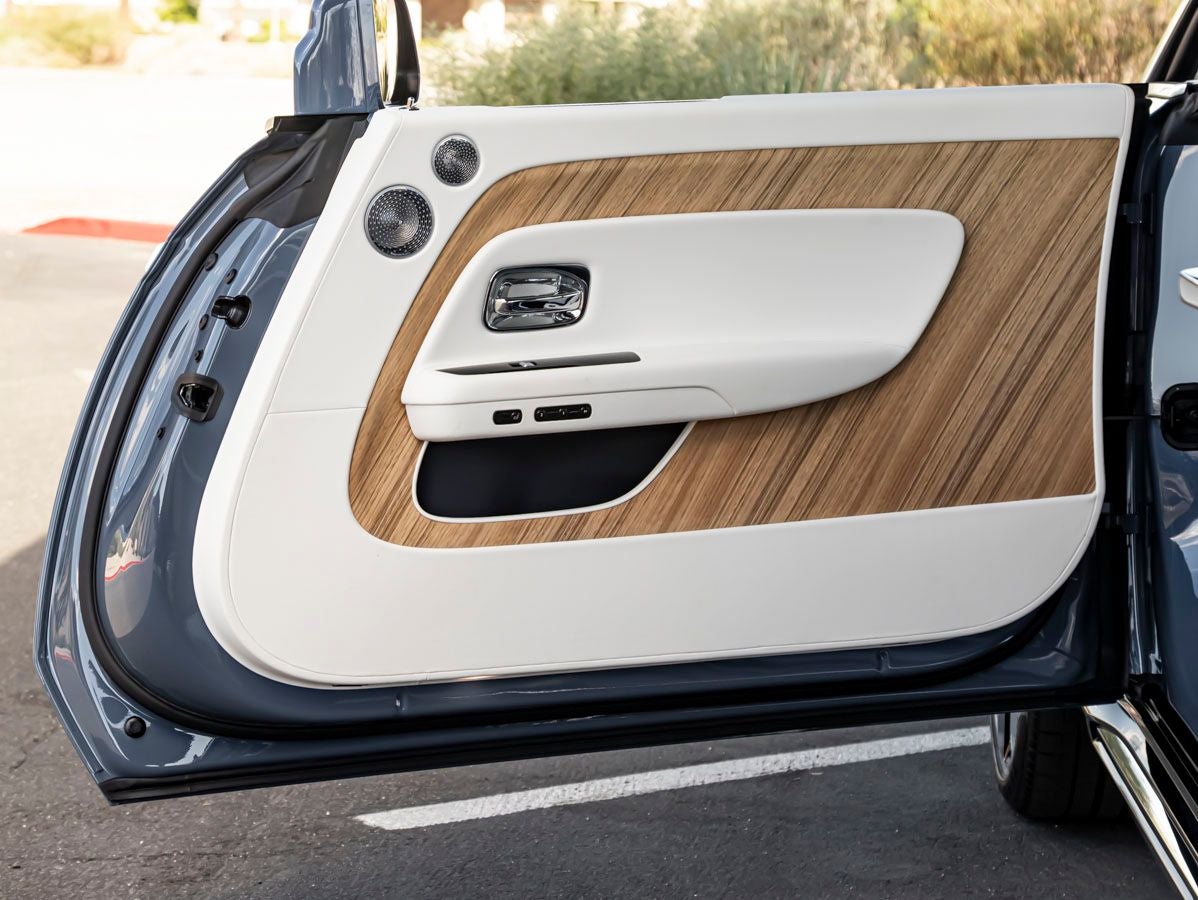 Step inside to experience a sanctuary of futuristic luxury, where craftsmanship meets cutting-edge design. The Grace White interior creates a serene and luminous environment, beautifully contrasted by Navy Blue stitching, colored inner stitching, contrast seat piping, and RR Monograms on all headrests. Open Pore Paldao wood trim introduces a natural elegance, while Canadel Doors provide a bold and immersive design statement. The Illuminated Fascia and Indulge Bespoke Clock add a sense of theater and refinement, while the veneered steering wheel spokes and colored steering wheel in Navy Blue showcase Rolls-Royces unparalleled attention to detail.