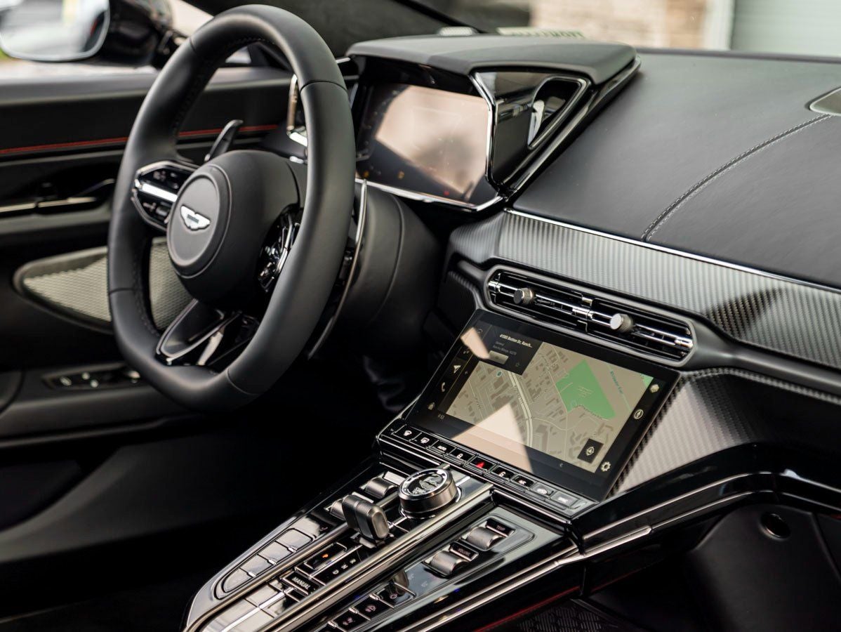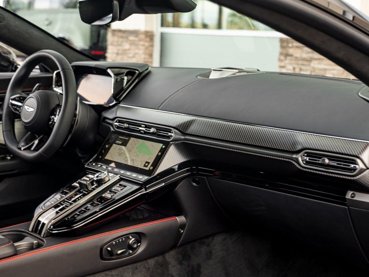 Inside, the cabin features the exclusive Inspire S Monotone Leather Interior with bold Spicy Red Contrast Stitching. The Interior Jewellery Pack in Satin Dark Chrome adds tasteful sophistication, while a Heated Steering Wheel ensures comfort year-round. A hidden Umbrella adds classic Aston Martin charm, and the immersive Bowers & Wilkins Audio System delivers rich, high-fidelity sound.